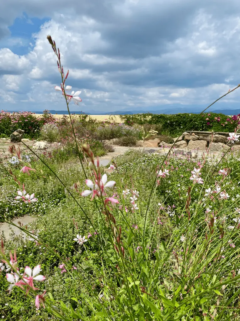 Er zijn borders op kleur en borders op vorm (dus met hetzelfde type bloem) aangelegd met planten, knollen en zaden. Dit als aanvulling op de ‘bosachtige’ energie van de omgeving.