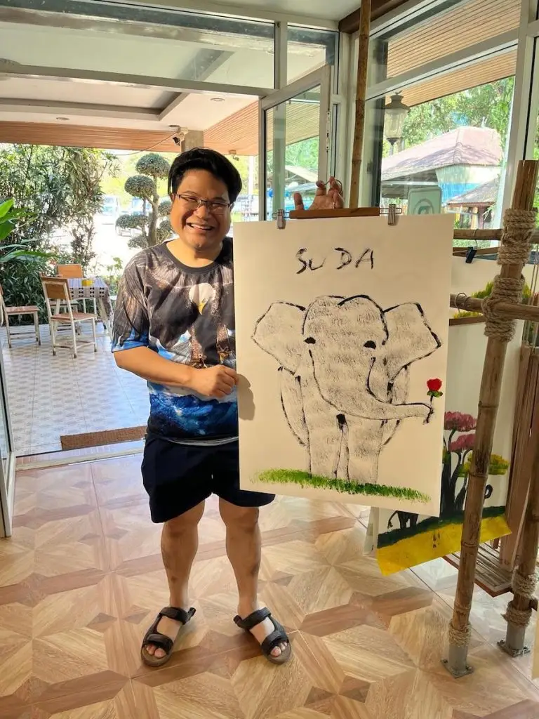 Door te geven, zul je beloond worden. Na de healing vroeg ik Thanakrit om hulp in de winkel. Want ik wilde een souvenir kopen voor mijn dochter. En ik zag een prachtig versierde houten schaal in de vorm van een olifant. De olifantenopvang doet ook hele leuke dingen. Zoals samen schilderen. En opeens trekt Thanakrit een schilderij uit het rek. Het ziet er vriendelijk en zacht uit. Het is een olifant, getekend door de olifant Suda. En ze houdt een roos vast. En zij die mijn technieken kennen weten: ik werk met rozen.