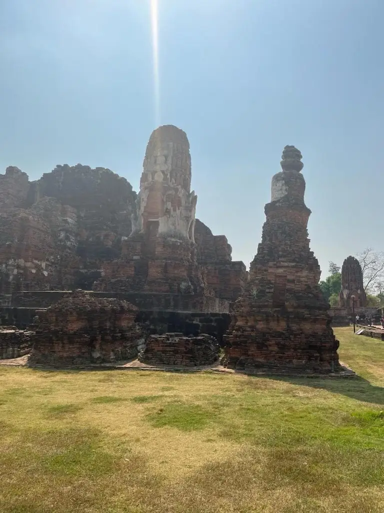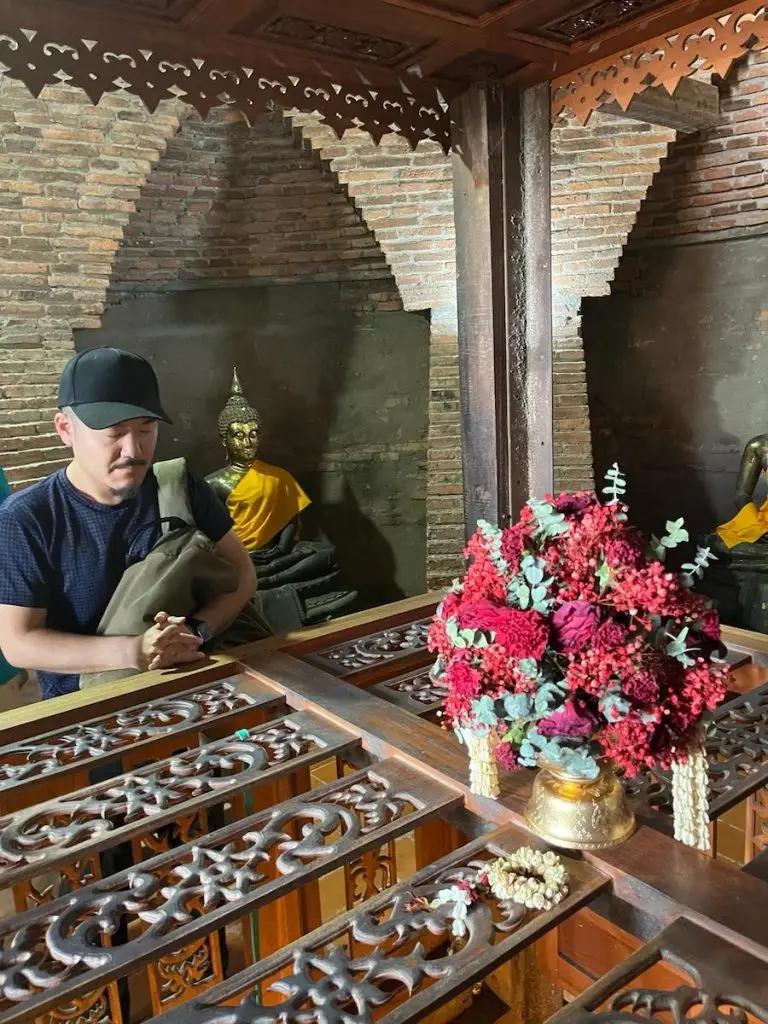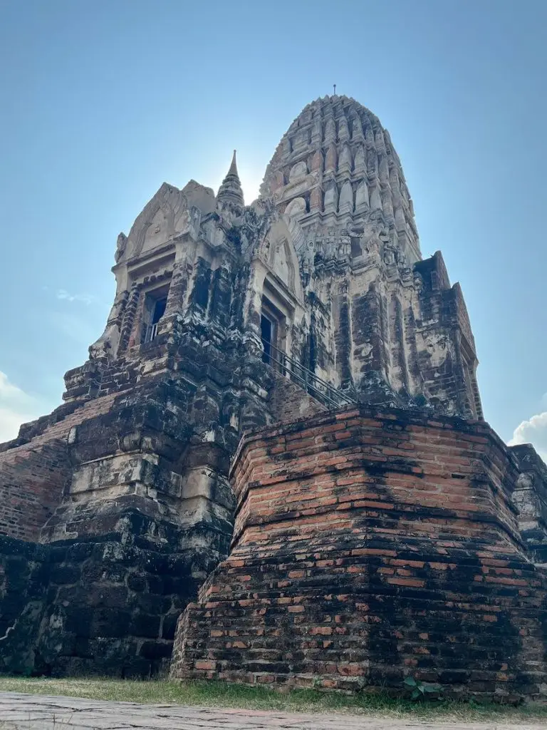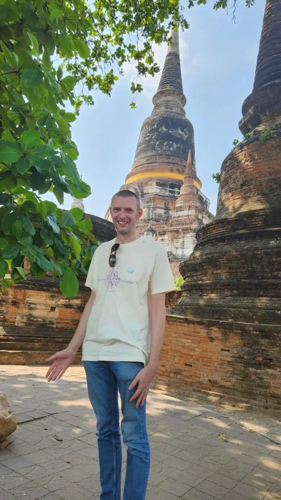 De volgende tempel die we bezoeken is Wat Ratchaburuna. Bij aankomst voelt het zwaar en conflictueus aan. Kentaro merkt deze energie ook op. En we kijken allebei op onze eigen manier om te zien wat er opgelost kan worden. Thanakrit vertelt ons dan dat het een plek is waar twee broers onenigheid met elkaar hadden. Maar voorbij de ingang komen we bij een tempel met een enorm krachtige vortex. We beklimmen de tempel. Bij binnenkomst merk ik de perfectie op in termen van dimensionale heilige geometrie. Eerst maak ik de vortex in het midden schoon. Dan lopen we terug naar de ingang van de tempel. Hier zie ik een tweede krachtpunt. Ik ga daar staan en herstel de energie in zijn authentieke staat.