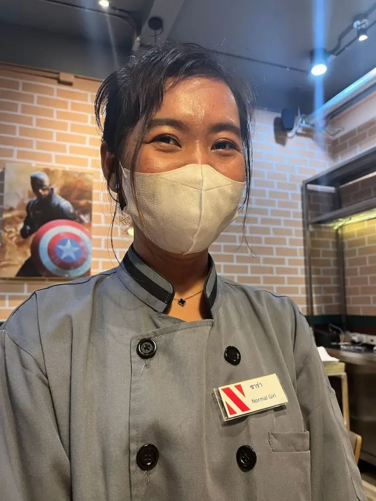 Zodra ik de naam van het restaurant zie, krijg ik een glimlach: Normal steak restaurant. Als we willen bestellen, zie ik het naambordje van de serveerster. Er staat ‘normal girl’ op. Ik kijk Ruth aan en we moeten hartelijk lachen.