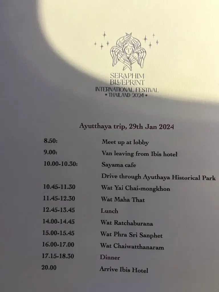 Thanakrit en zijn team hadden een geweldige dag georganiseerd op de maandag. Ik zal jullie niet vermoeien met hoe vaak we die dag allemaal driedubbele nummers hebben gezien. Maar het busje dat ons rondreed had het kenteken 4442. En zelfs bij het tanken aan het einde van de dag kostte de brandstof 29,99 Baht. Ik keek Gordon aan, die ook al de hele dag de getallen zag, en hij begon te lachen. Maar ik merkte ook andere vormen van goddelijke timing tijdens deze dag. Ik zal er meer over vertellen. Ik wilde het programma graag fotograferen. Onderweg nam ik er een foto van. Precies op dat moment wordt plotseling de Seraphim verlicht.