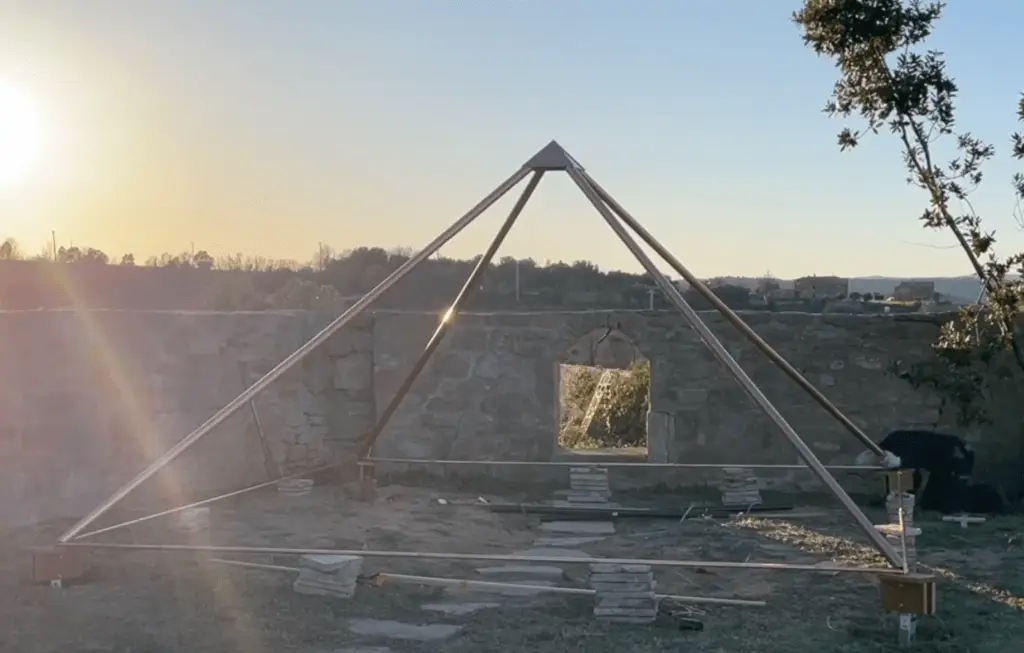 In de voortuin hebben we een koperen piramide met een doorsnede van 6,30 meter gebouwd. Bekijk de video van de aanleg.